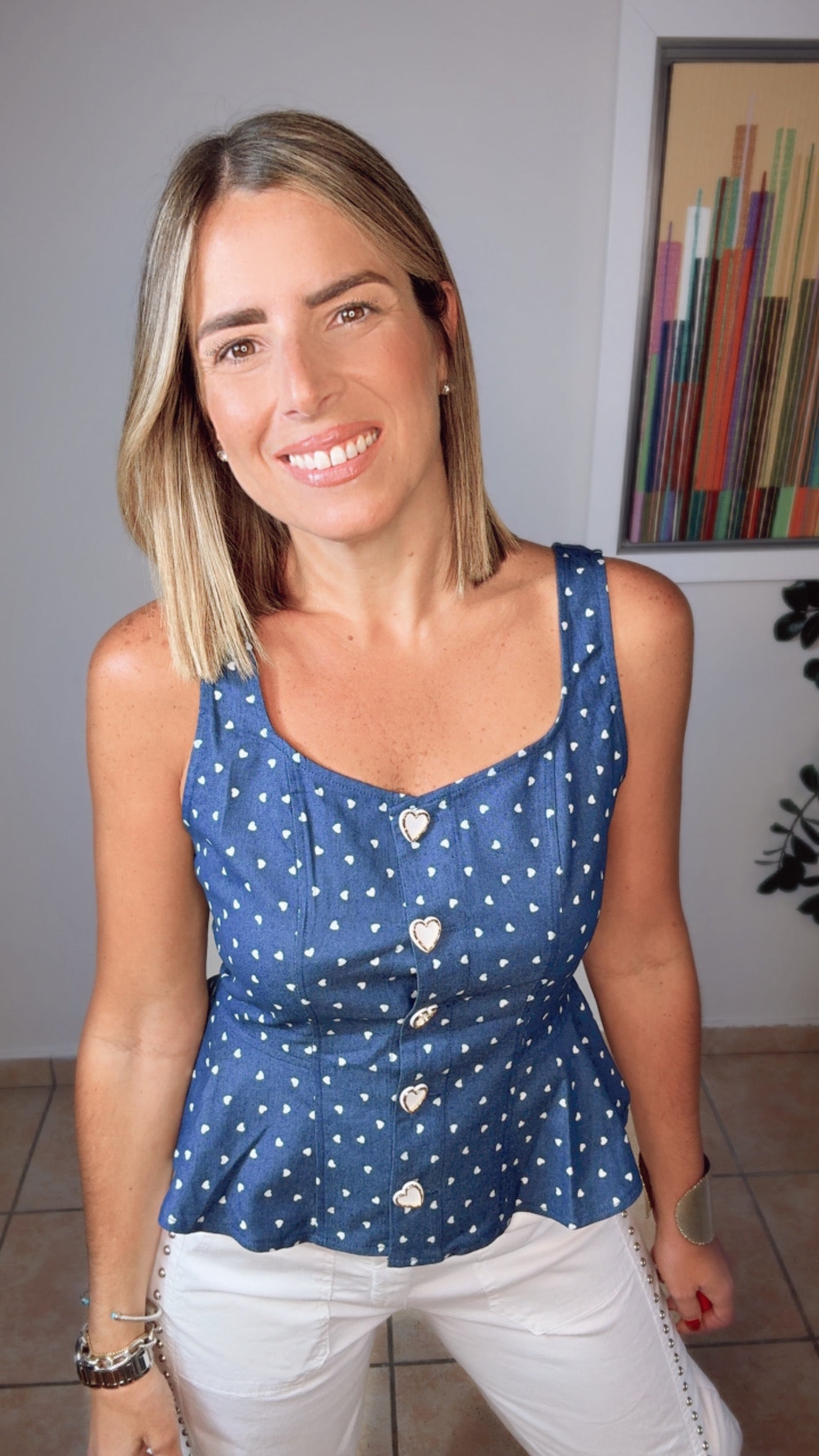 Sleveless heart button, polka dot peplum denim shirt.